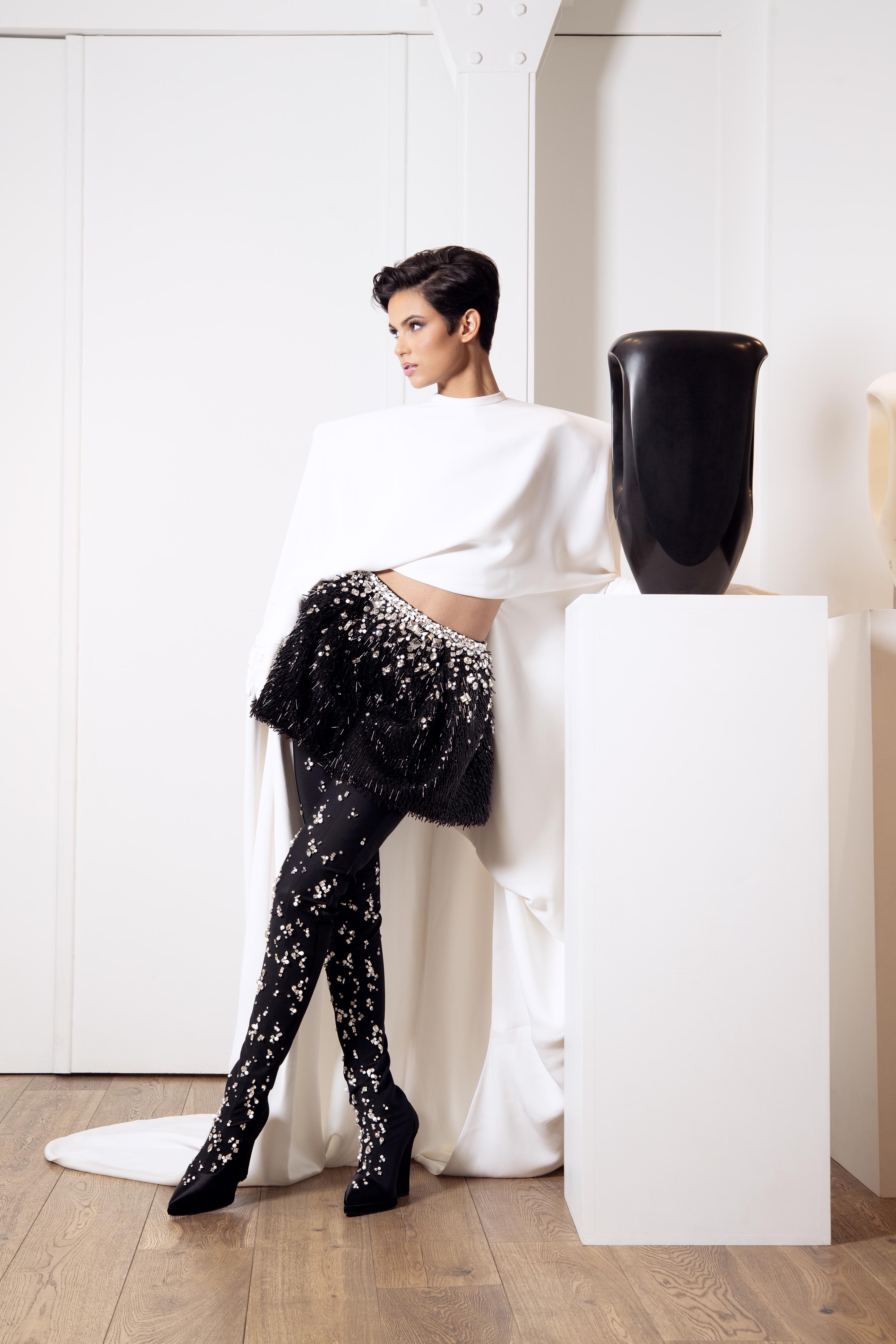 EDITO Fashion Spider with Ève Gilles, MUA: YASIN BEJA. Stéphane Rolland : Top à traîne sur short entièrement brodé et cuissardes assorties / Galerie Negropontes