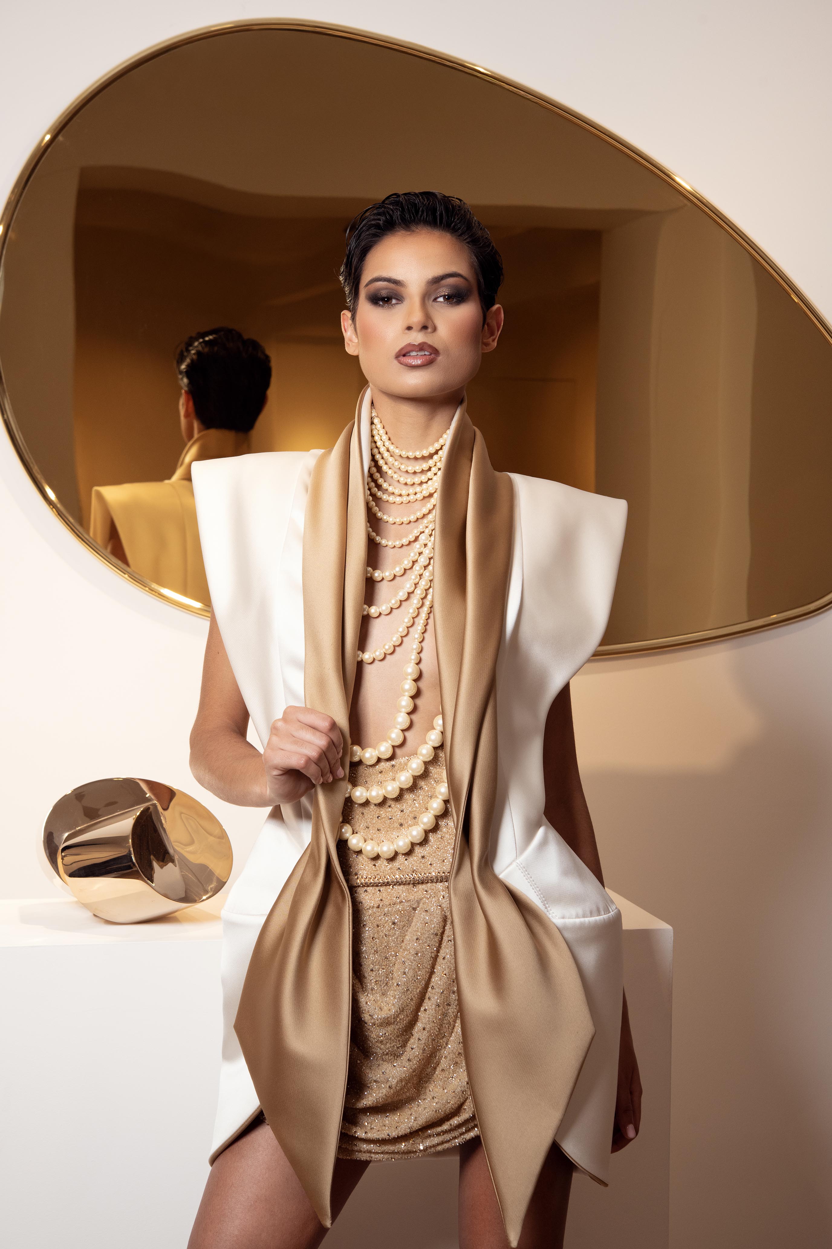 EDITO FASHION SPIDER WITH ÈVE GILLES, MUA: YASIN BEJA. Georges Chakra : Veste géométrique sur mini-jupe brodée/ GALERIE NEGROPONTES