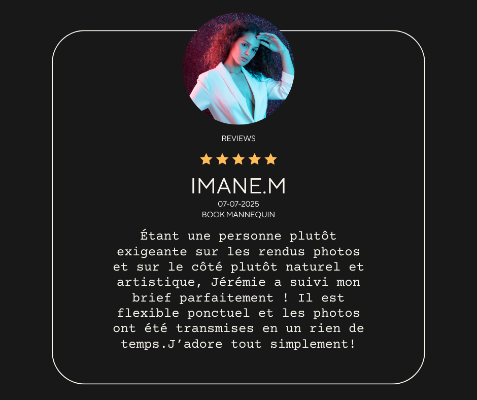 Fort de mon expérience, je sais parfaitement ce que recherchent les agences. Je serai à vos côtés pour vous conseiller sur les poses à adopter et vous aider à incarner des attitudes parfaites devant l’objectif. Mon accompagnement vous permettra d’optimiser chaque prise et de révéler le meilleur de vous-même.